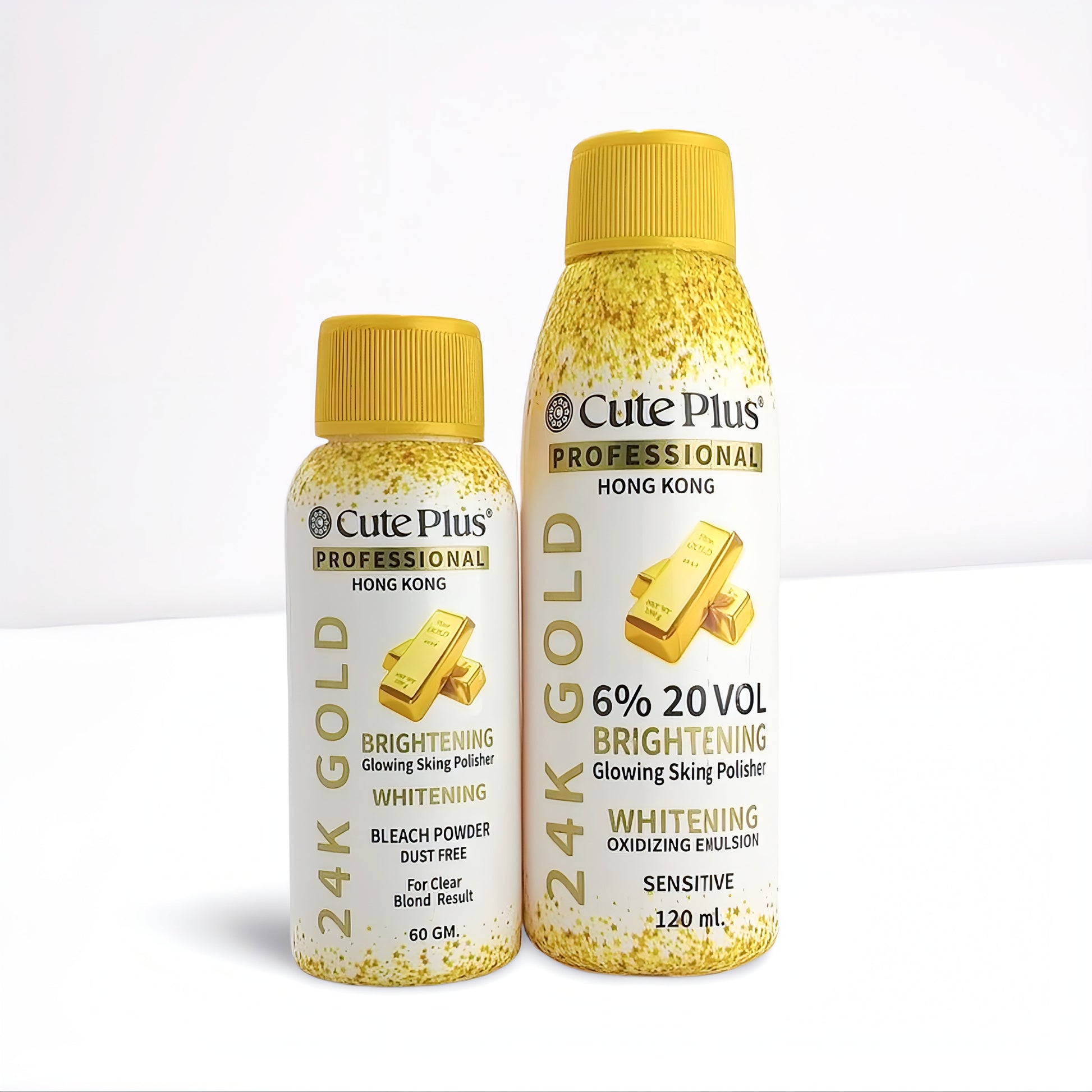 The Cute Plus Professional 24K Gold Skin Polisher Set provides the essential two-step system for achieving an enviable, luminous complexion at home. This kit combines a 24K Gold Bleach Powder with a 6% (20 Volume) Oxidizing Emulsion to create a treatment that instantly brightens skin, reduces dullness, and gently blends unwanted facial hair. Formulated to be SENSITIVE, it delivers professional brightening without excessive irritation.