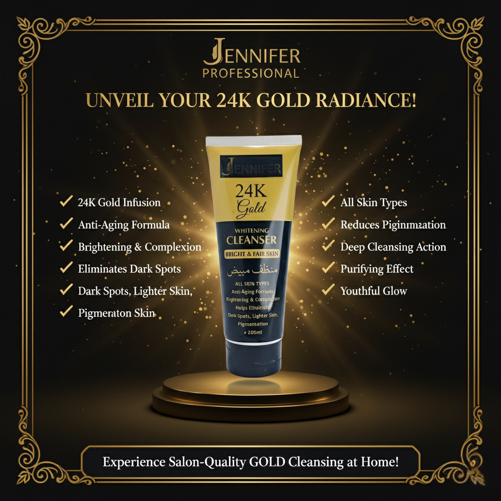 Elevate your daily skincare routine with the Jennifer 24K Gold Whitening Cleanser. Infused with the brilliance of 24K Gold, this luxurious cleanser is designed to gently remove dirt, oil, and impurities while brightening the complexion. Its advanced anti-aging formula helps minimize pigmentation, fade dark spots, and promote lighter, even-toned skin. Suitable for all skin types, it leaves your face feeling fresh, smooth, and glowing with radiance.