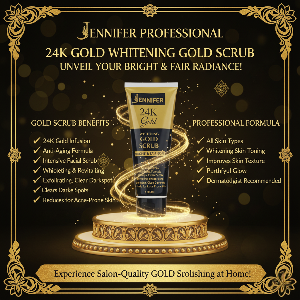Reveal your skin’s true brilliance with the Jennifer 24K Gold Whitening Gold Scrub. Powered by the radiance of 24K Gold and advanced exfoliating actives, this intensive facial scrub works to remove dead skin cells, unclog pores, and smooth rough texture. Its anti-aging formula not only brightens and revitalizes but also helps fade dark spots and acne marks, leaving your complexion clear, soft, and luminous. Suitable for all skin types, it’s the perfect way to achieve polished, youthful-looking skin.