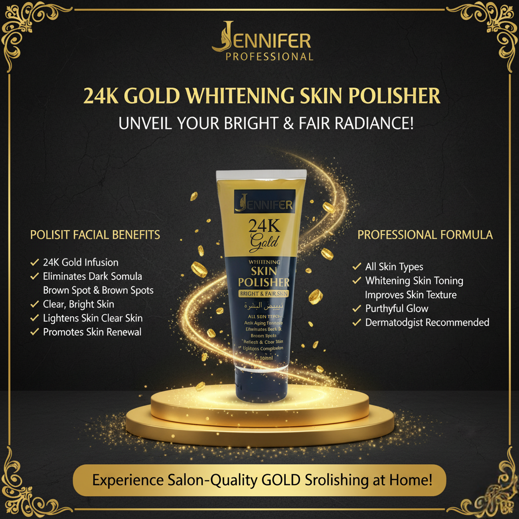 Experience the luxury of radiant skin with the Jennifer 24K Gold Whitening Skin Polisher. Infused with 24K Gold extracts, this advanced formula is designed to gently polish away impurities, brighten dullness, and smooth uneven texture. Its anti-aging blend helps minimize the appearance of fine lines, dark spots, and discoloration—revealing a refreshed, youthful, and fairer complexion. Suitable for all skin types, it’s your ultimate solution for clear, glowing, and refined skin.