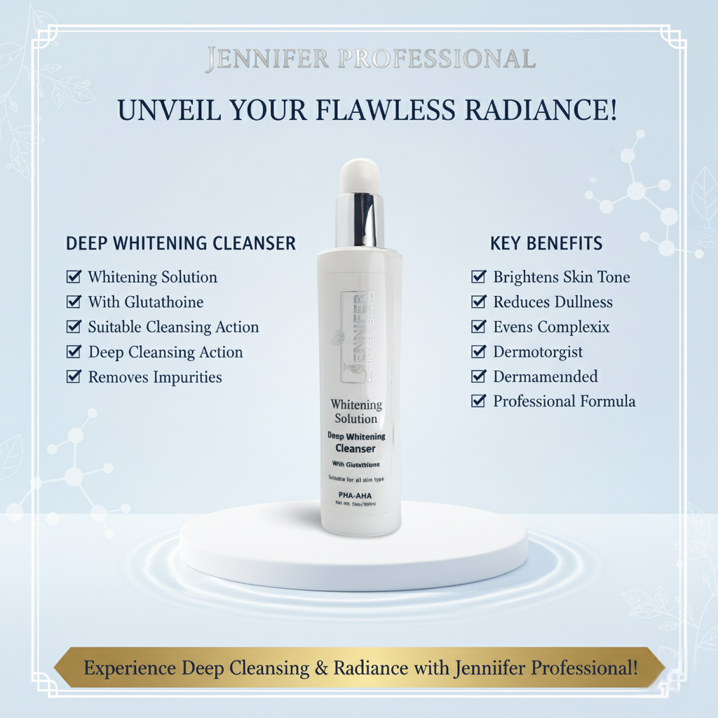 Start your skincare routine with the power of clarity and brightness. The Jennifer Professional Whitening Solution Deep Whitening Cleanser is a luxurious foaming cleanser enriched with Glutathione, PHA (Polyhydroxy Acid), and AHA (Alpha Hydroxy Acid). This formula gently purifies pores, removes excess oil, dirt, and makeup, while supporting a brighter, more even skin tone. Designed for all skin types, it deeply cleans without stripping moisture—leaving your skin refreshed, smooth, and glowing.