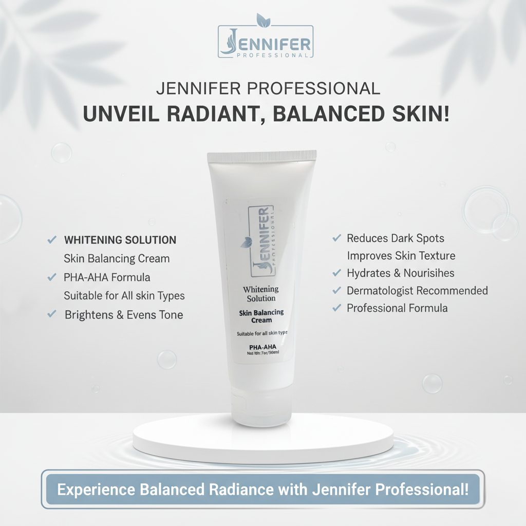 Discover radiant, healthy-looking skin with the Jennifer Professional Whitening Solution Skin Balancing Cream. Expertly formulated with PHA (Polyhydroxy Acid) and AHA (Alpha Hydroxy Acid), this cream works gently yet effectively to brighten, smooth, and balance your complexion. Suitable for all skin types, it helps restore natural clarity, reduces dullness, and supports an even skin tone—leaving your skin refreshed, soft, and luminous.