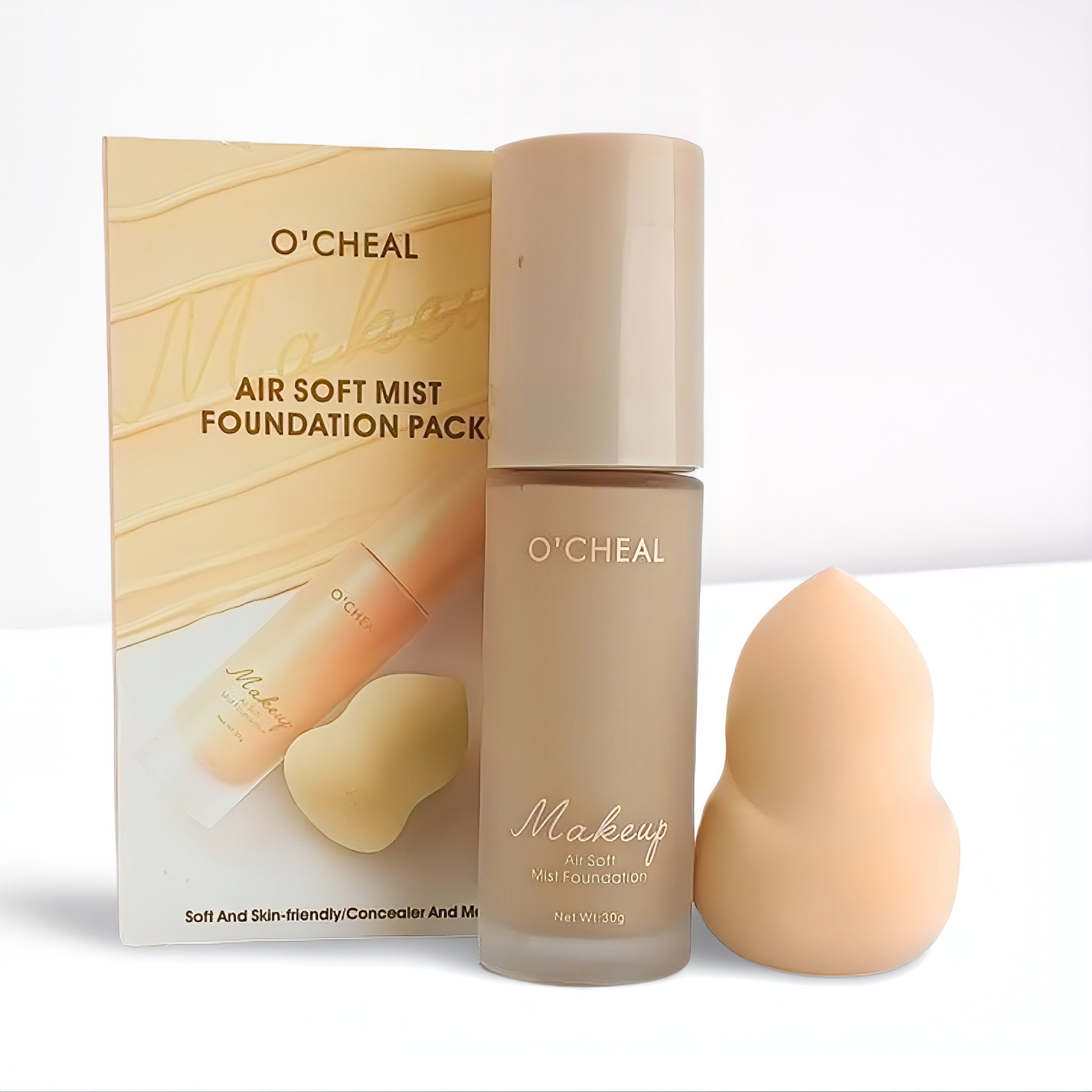 The O'Cheal Air Soft Mist Foundation Pack is a 2-in-1 makeup kit designed for effortless, flawless application. It features a modern liquid foundation with an ultra-light, Air Soft Mist Finish, paired with a unique, soft beauty sponge for seamless blending. This foundation is explicitly marketed for its skin-friendly, moisturizing, and concealing benefits, making it ideal for daily wear.