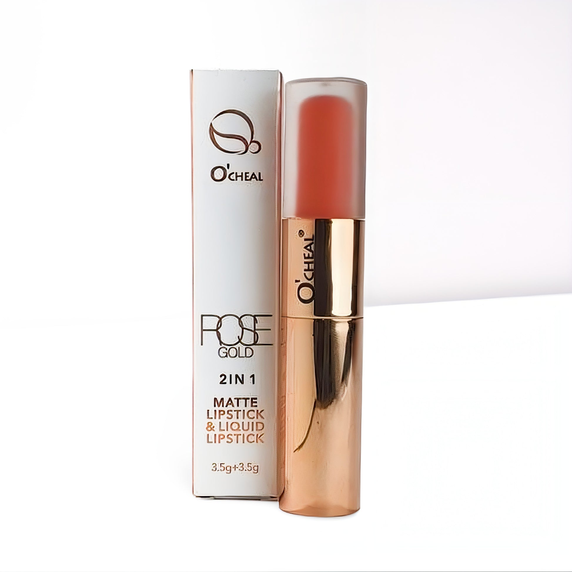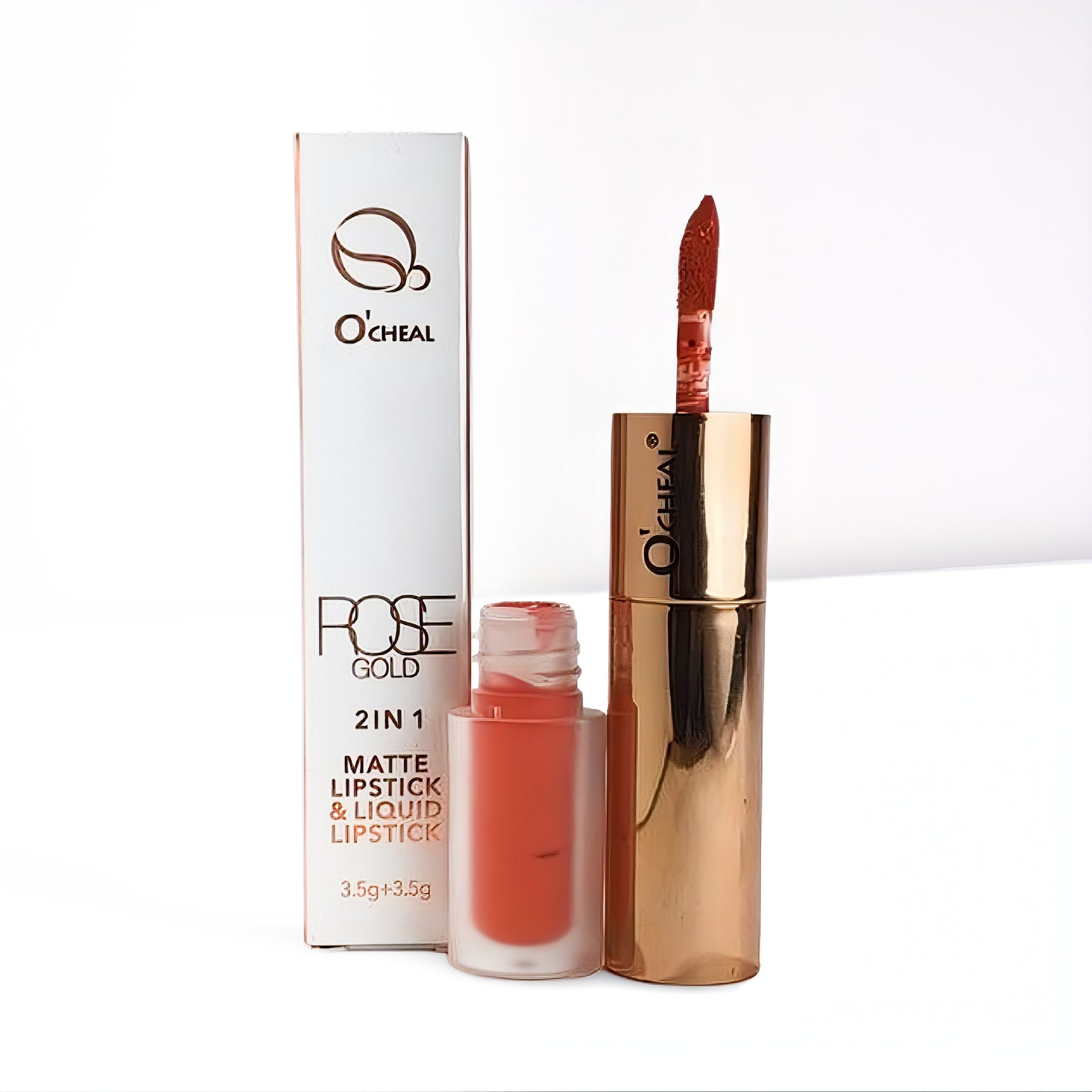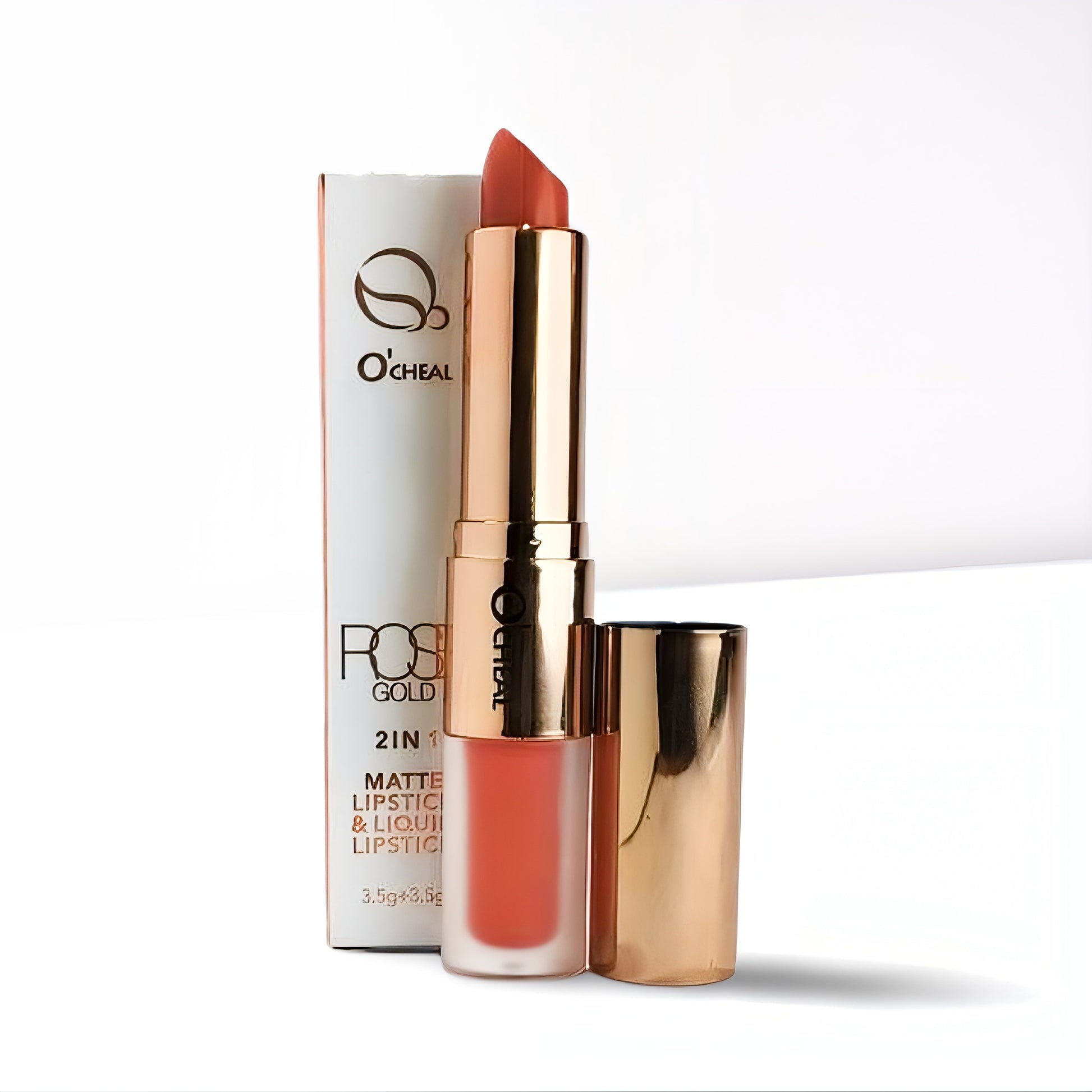This product is a versatile, dual-ended lip product from O'Cheal featuring a 2 IN 1 design: a MATTE LIPSTICK on one end and a LIQUID LIPSTICK (Gloss/Velvet finish) on the other. The ROSE GOLD aesthetic is a popular theme for makeup.