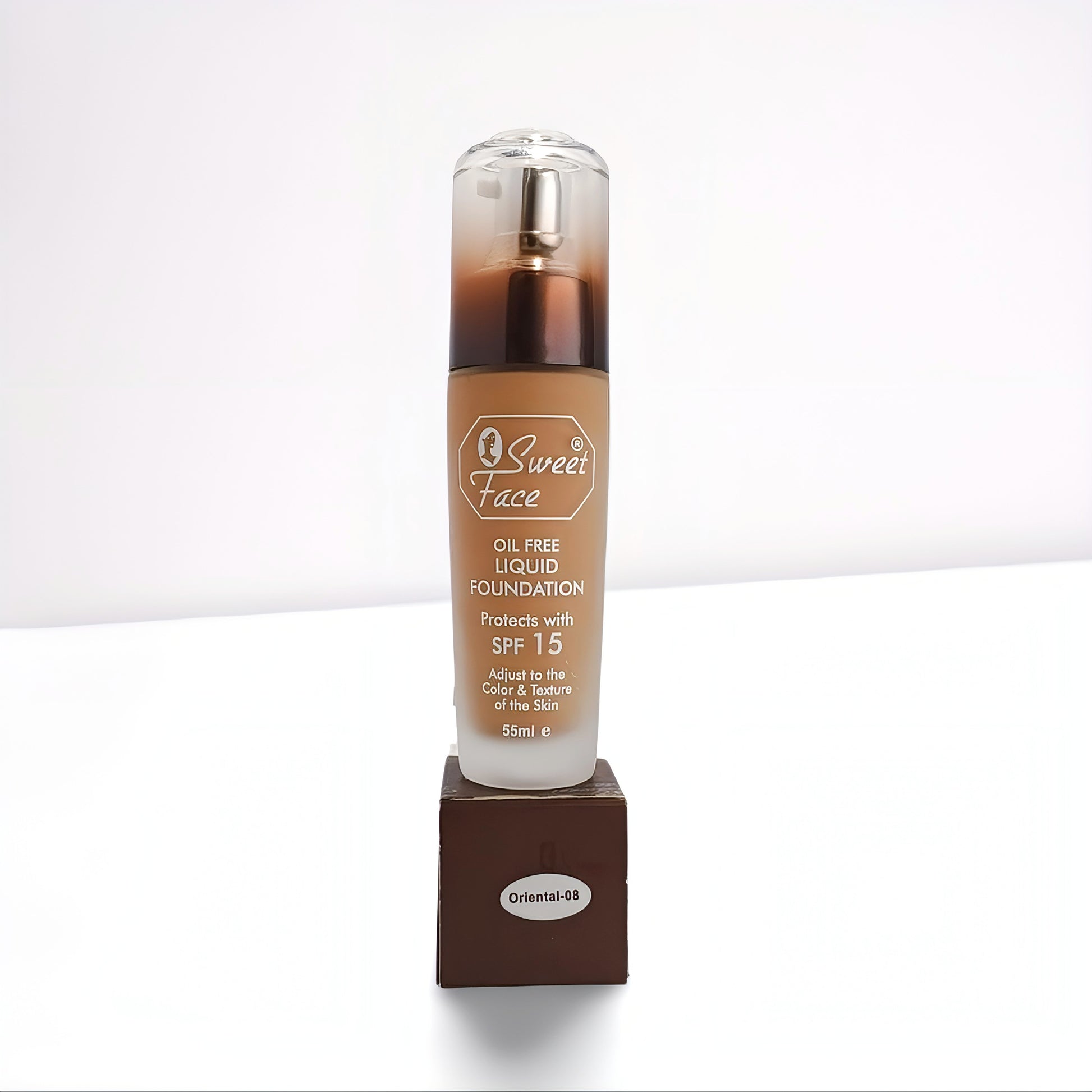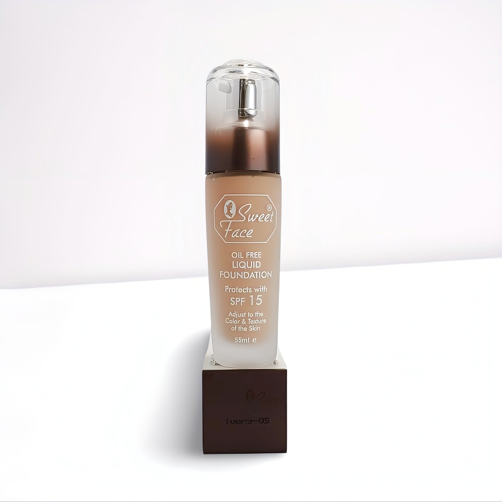 Introducing the Sweet Face Oil-Free Liquid Foundation with SPF 15, a perfect blend of skincare and makeup. This 55ml foundation not only protects your skin from harmful UV rays but also adjusts to your unique skin tone for a flawless finish.